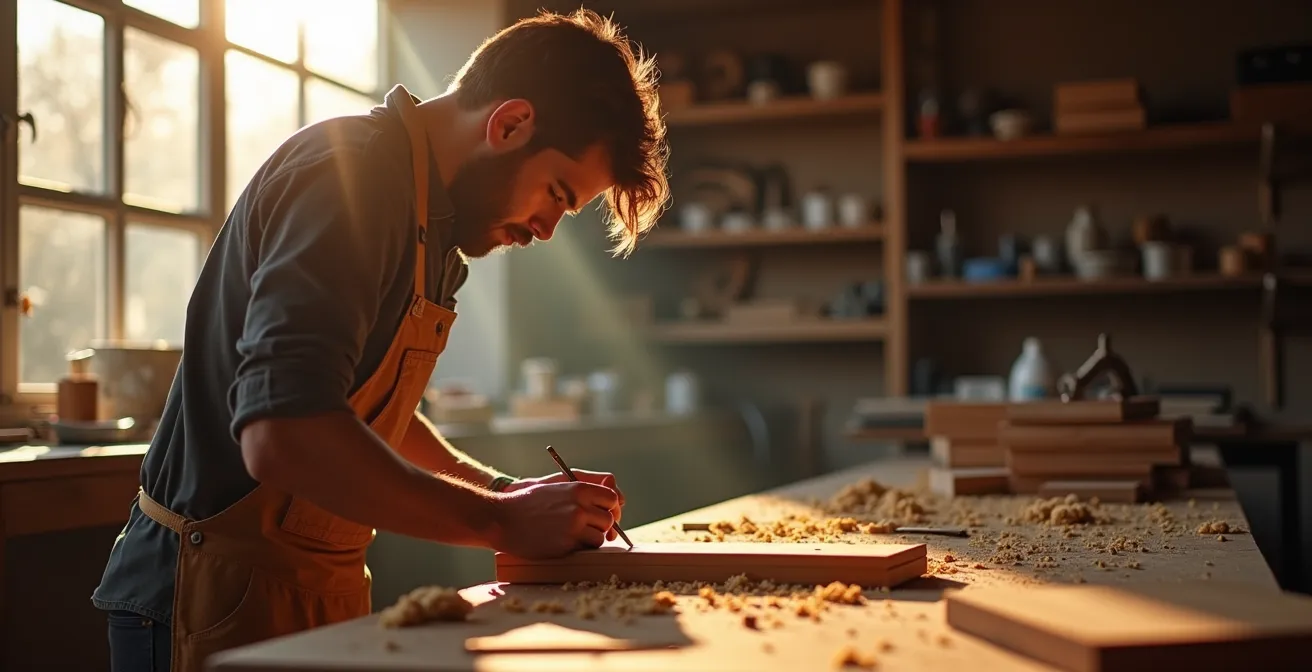 Anstatt abstrakt zu überlegen, was Sie bauen könnten, folgen Sie einem erprobten Plan. Ein perfektes Beispiel für den Einstieg ist ein minimalistisches Gewürzregal aus Holz. Es ist nützlich, stilvoll und erfordert nur grundlegende Techniken. Die nachfolgende Illustration fängt den entscheidenden Moment der Vorbereitung ein: die Konzentration und Präzision, die den Grundstein für das Gelingen legen.